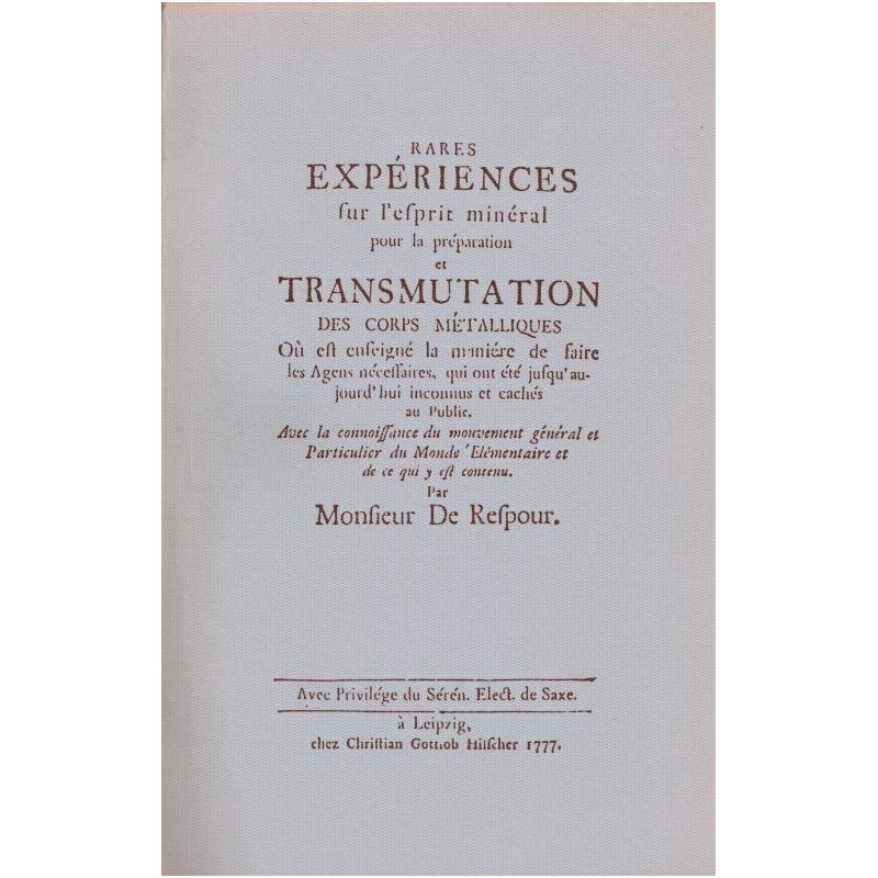 Rares expériences sur l'esprit minéral pour la préparation et Transmutation des corps métalliques