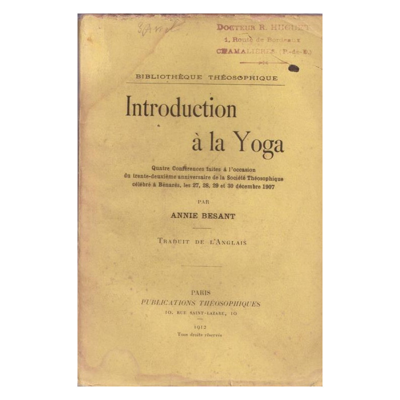 Introduction à la Yoga. Quatre conférences faites à l'occasion du trente-deuxième anniversaire de la Société Théosophique célébré à Bénarès les 27 28 29 et 30 décembre 1907